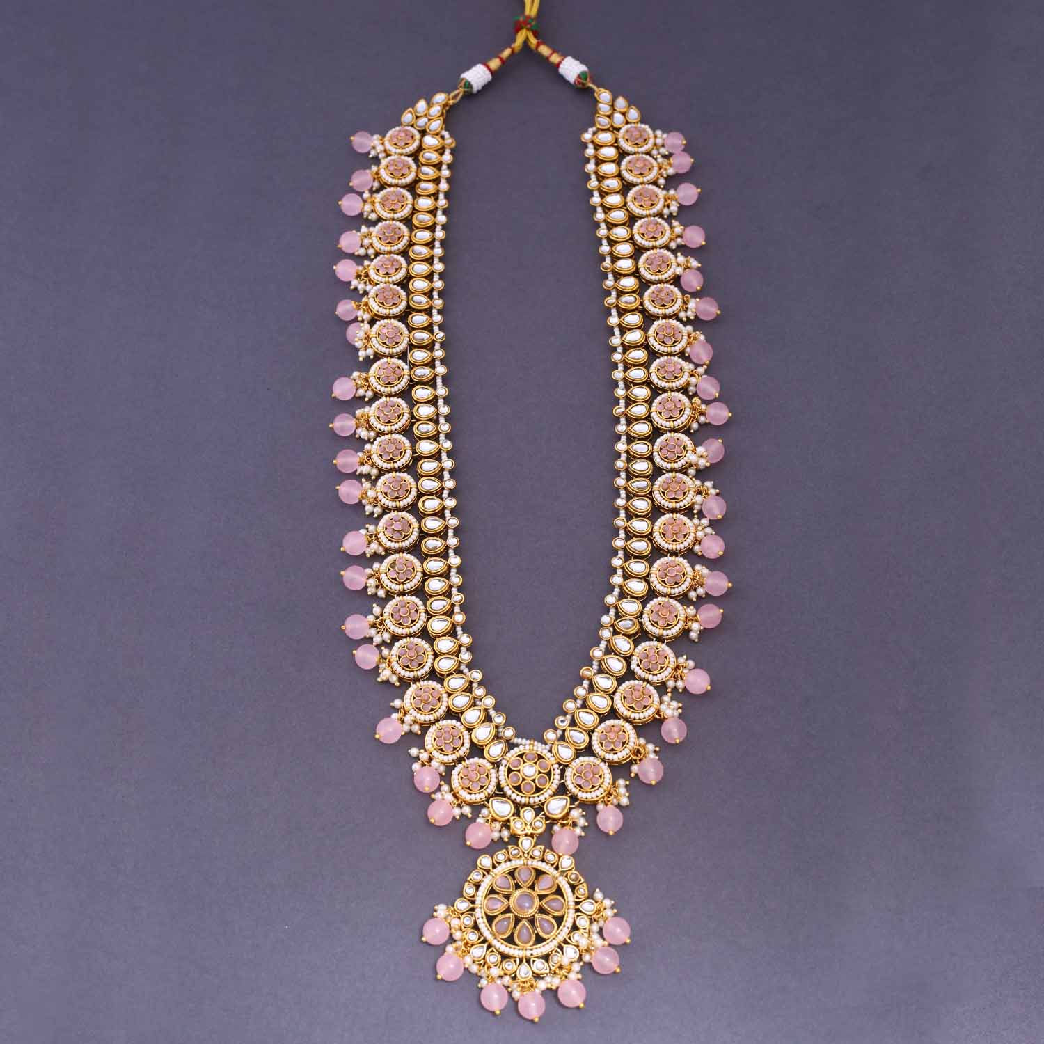 The set includes a stunning necklaces, matching earrings, and a beautiful maang tikka, all meticulously crafted with high-quality Kundan stones and lustrous pearls. The gold-plated finish adds a touch of elegance, making it a perfect complement to any bridal ensemble. With proper care, this jewelry will remain a cherished keepsake for years to come