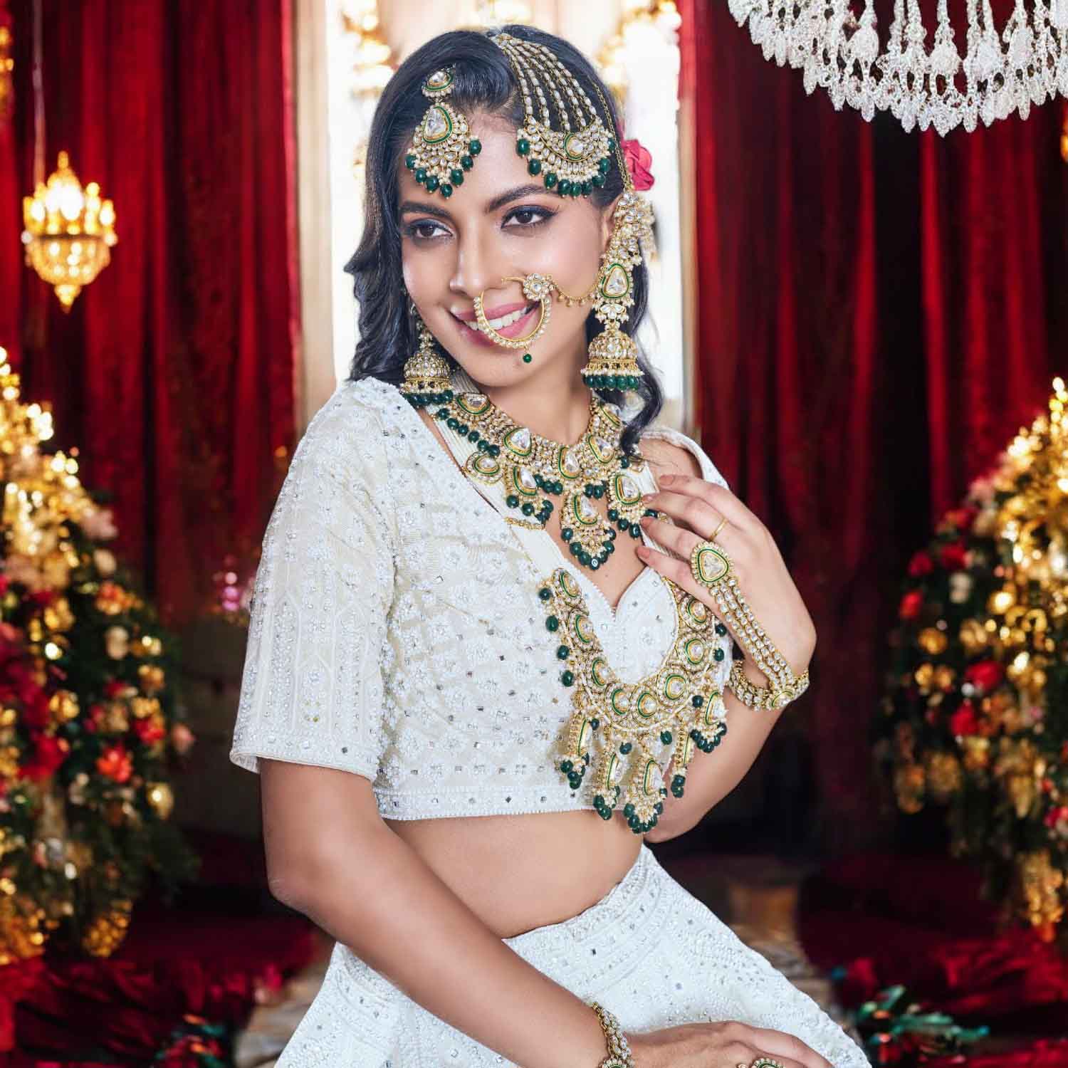 - Unit: Two Necklaces, One Pair Of Earrings, One Maang Tikka, One Matha Patti, Pair of Hathphool and a Nath.