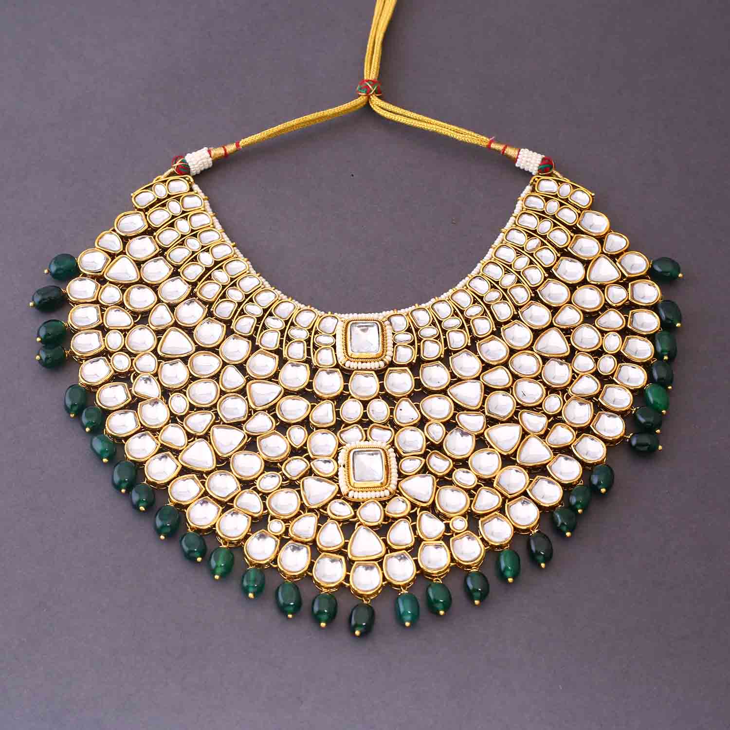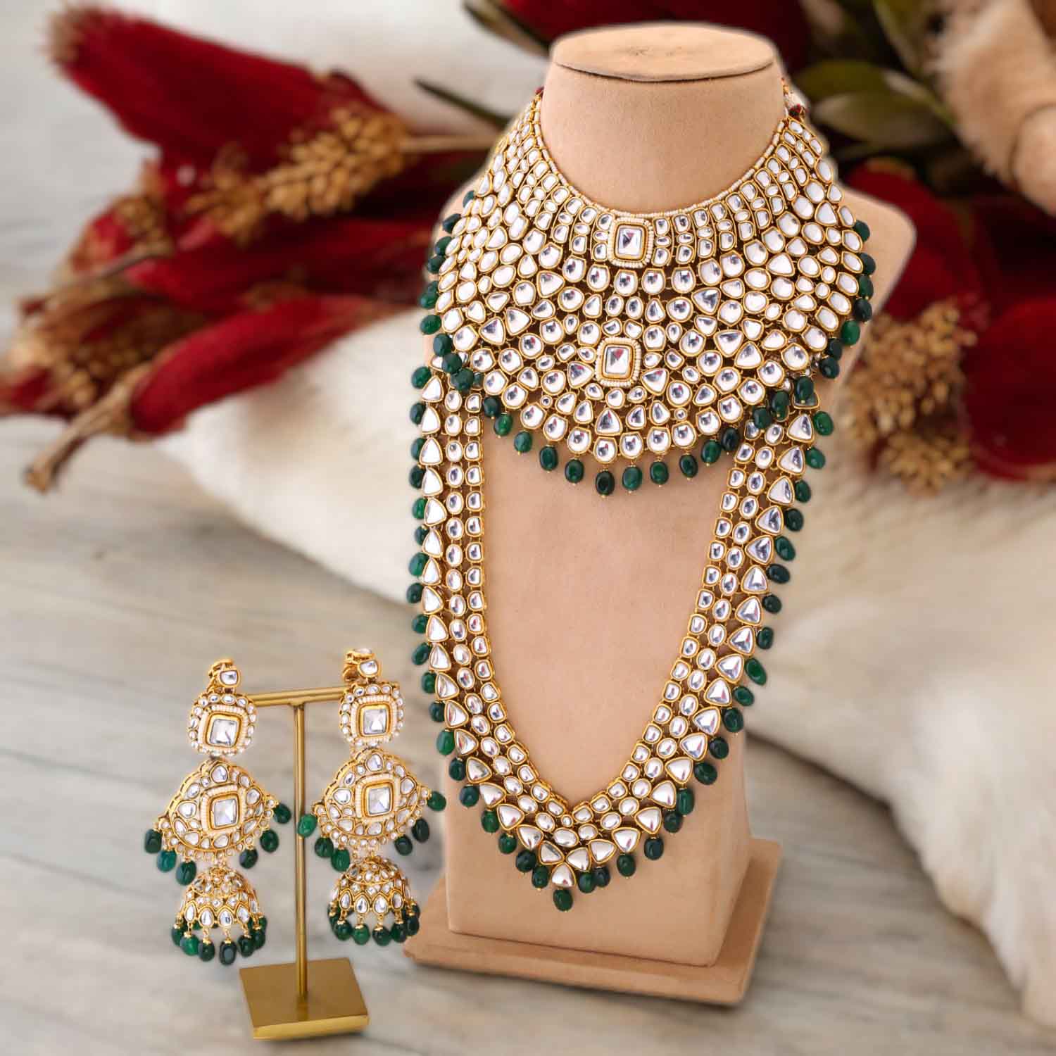 The set includes a stunning necklaces, matching earrings, and a beautiful maang tikka, all meticulously crafted with high-quality Kundan stones and lustrous pearls. The gold-plated finish adds a touch of elegance, making it a perfect complement to any bridal ensemble. With proper care, this jewelry will remain a cherished keepsake for years to come