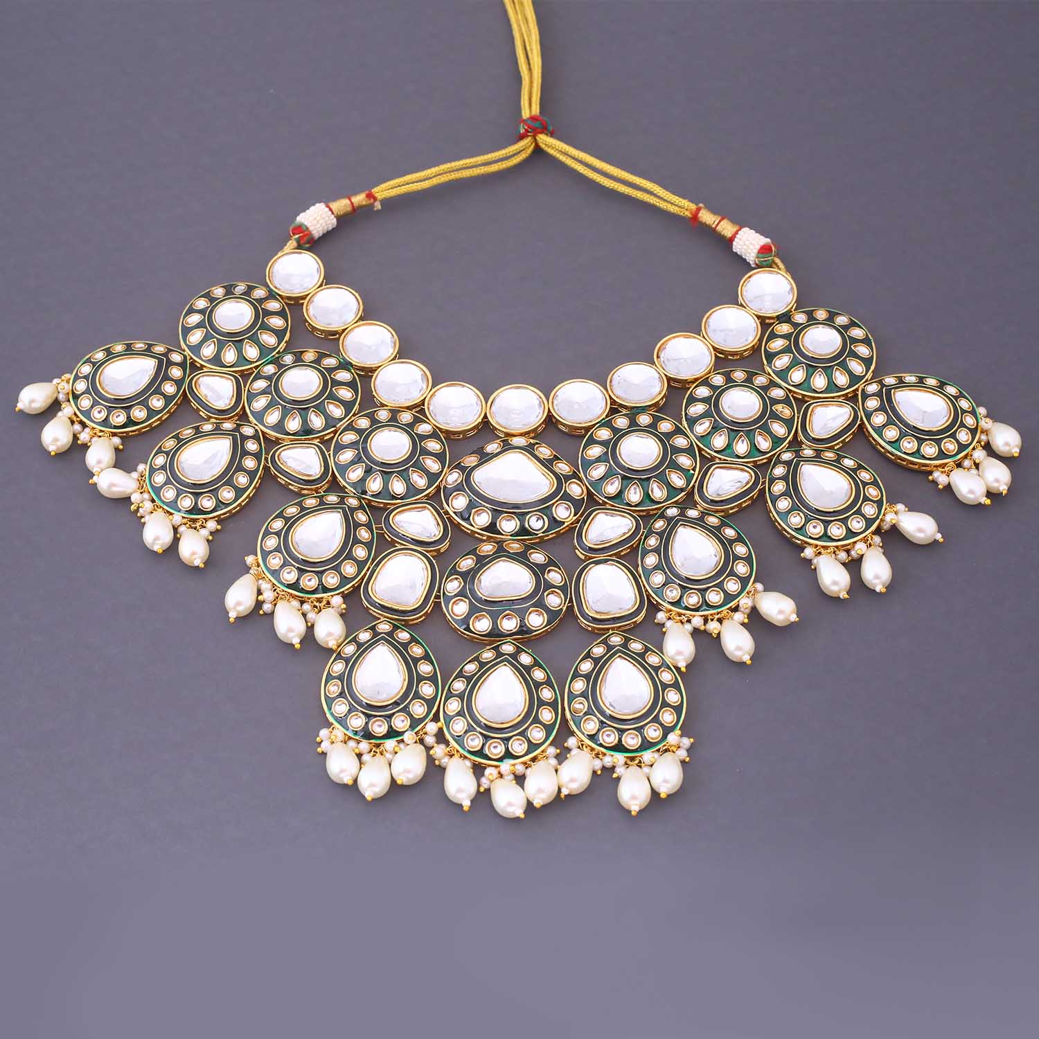 The set includes a stunning necklaces, matching earrings, and a beautiful maang tikka, all meticulously crafted with high-quality Kundan stones and lustrous pearls. The gold-plated finish adds a touch of elegance, making it a perfect complement to any bridal ensemble. With proper care, this jewelry will remain a cherished keepsake for years to come