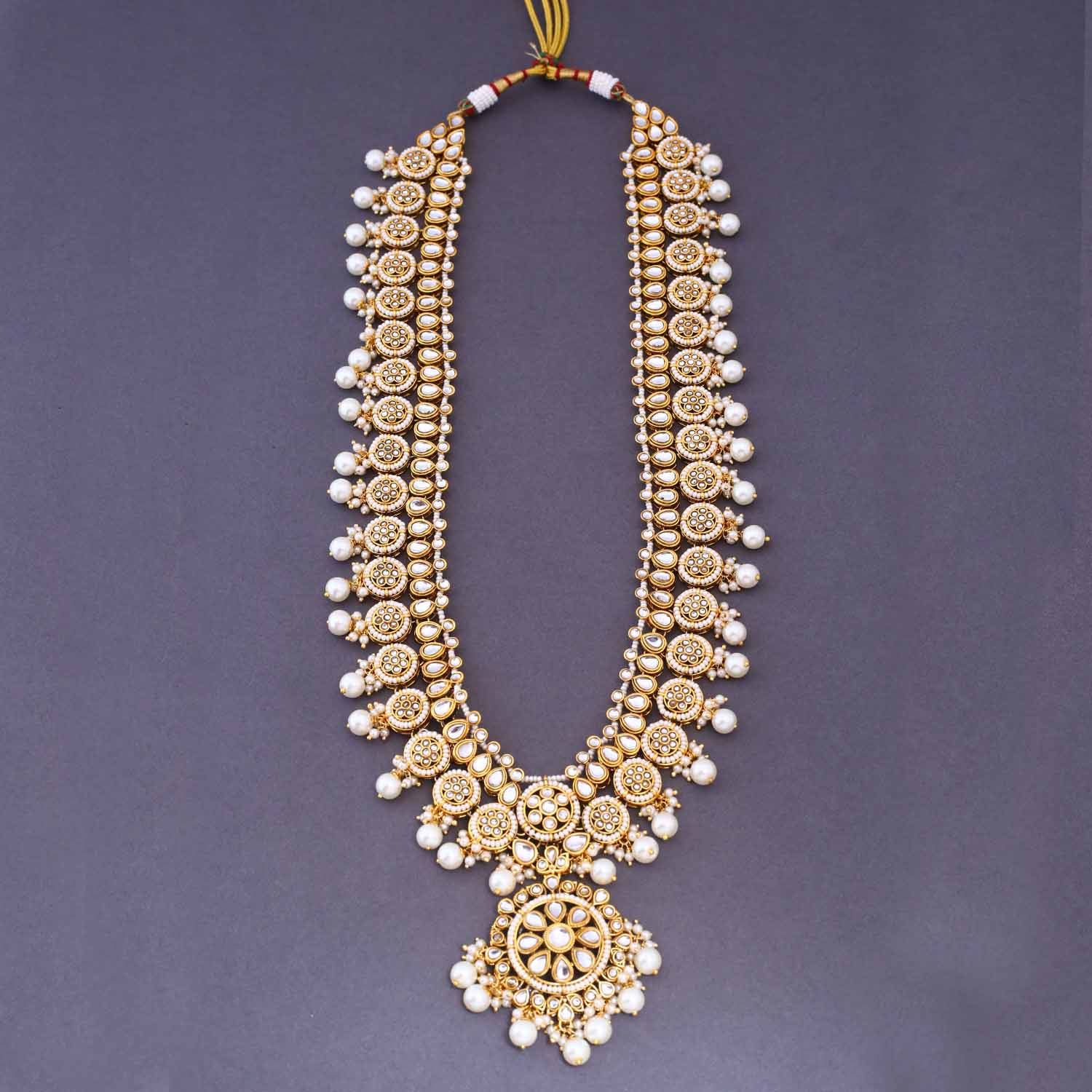 The set includes a stunning necklaces, matching earrings, and a beautiful maang tikka, all meticulously crafted with high-quality Kundan stones and lustrous pearls. The gold-plated finish adds a touch of elegance, making it a perfect complement to any bridal ensemble. With proper care, this jewelry will remain a cherished keepsake for years to come