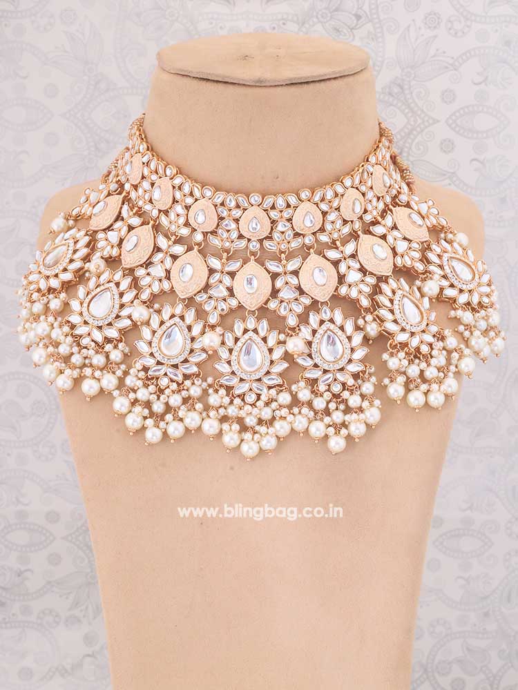 This necklace is the ultimate accessory option for the festive season. This set has a gorgeous circular floral pattern. The necklace has vibrant pearl detailing all over. The set also has a bright element of Kundan detailing in its structure. So, don't miss out on this gorgeous necklace set this eventful season as you have ramps to walk ahead.