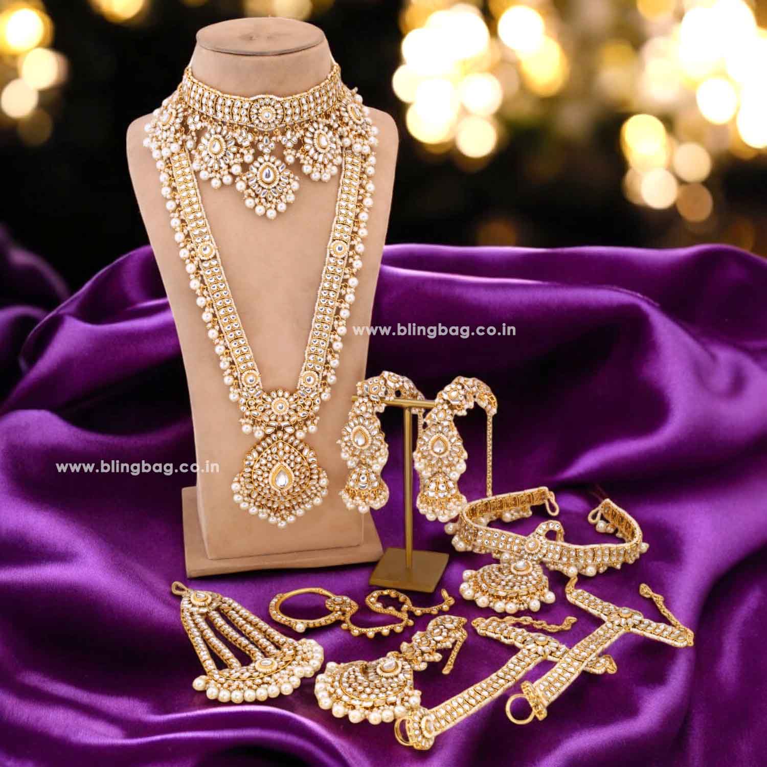 - Unit: Two Necklaces, One Pair Of Earrings, One Maang Tikka, One Matha Patti, Pair of Hathphool, One Passa and a Nath.