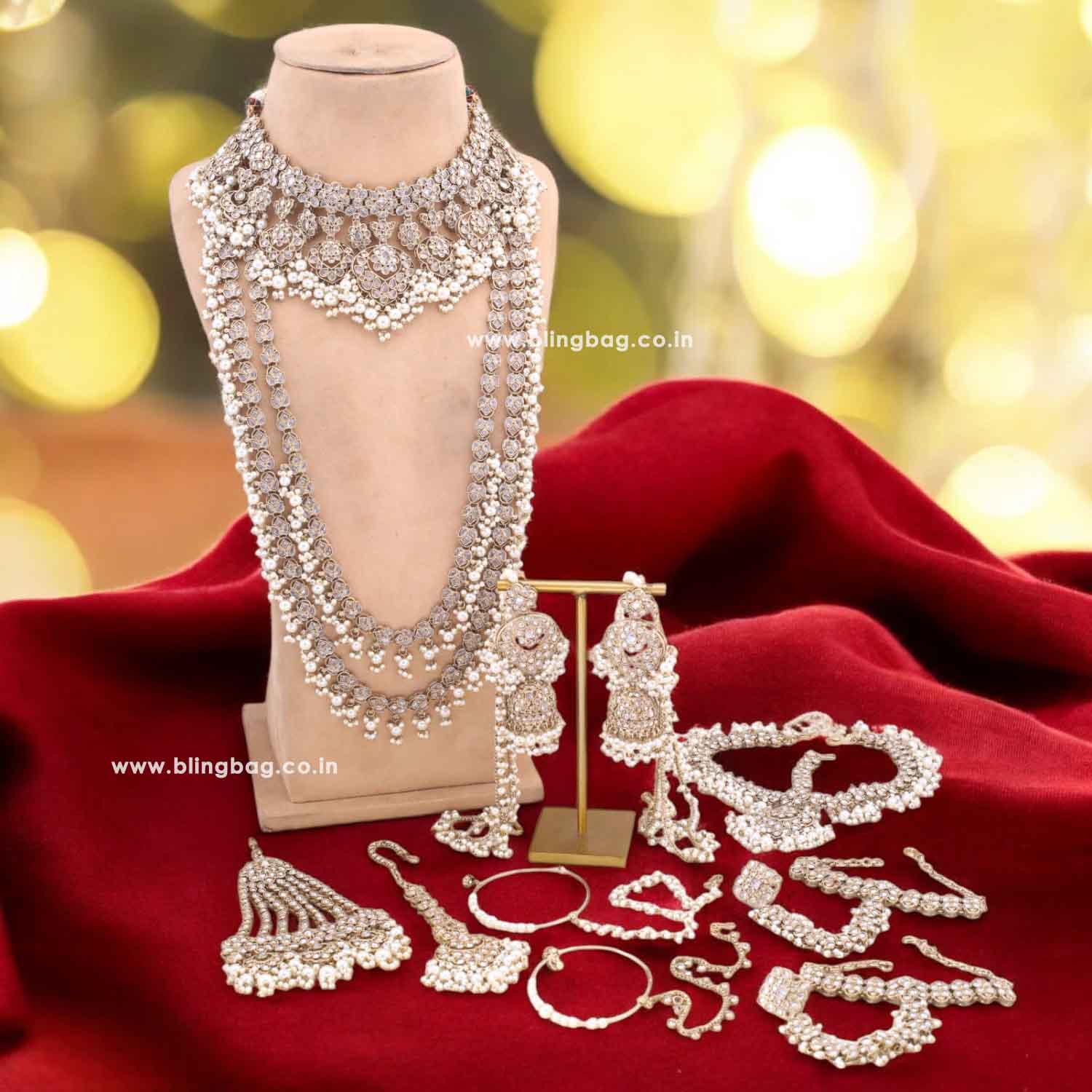 - Unit:Two Necklaces, One Pair Of Earrings, One Maang Tikka, one Pair of Hathphool, One Passa, Two Nath and one Matha Patti.