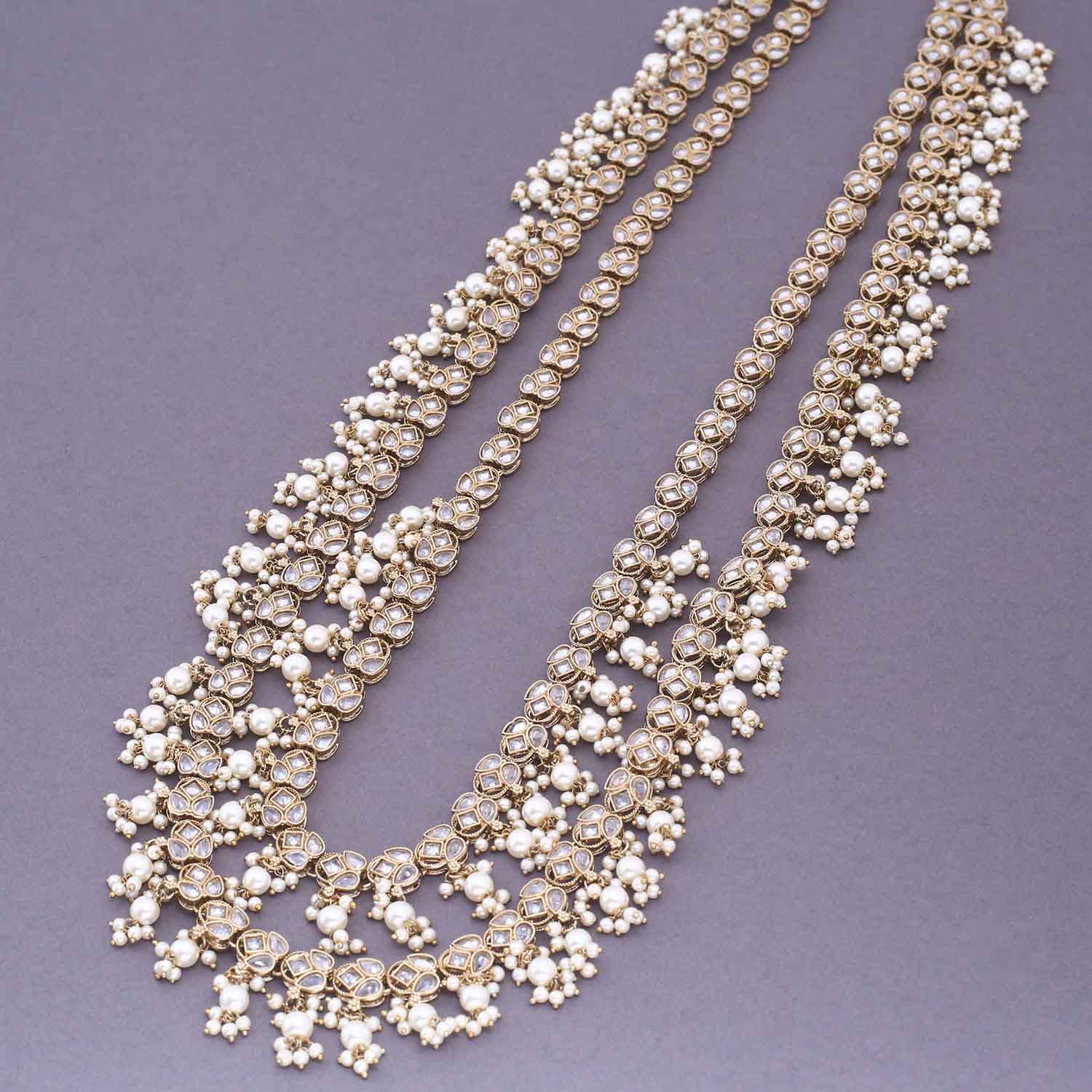 The set includes a stunning necklaces, matching earrings, and a beautiful maang tikka, all meticulously crafted with high-quality Kundan stones and lustrous pearls. The gold-plated finish adds a touch of elegance, making it a perfect complement to any bridal ensemble. With proper care, this jewelry will remain a cherished keepsake for years to come
