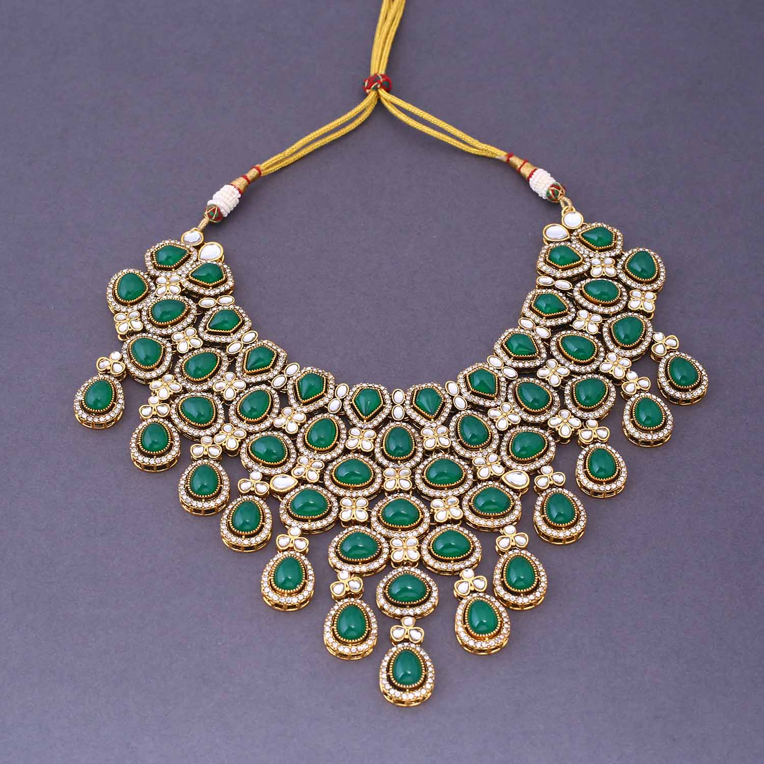 A beautiful set of Golden Necklaces to enhance the ever-so-beautiful bride on her special occasion or for you to attend a very special Wedding/Party. Made with high-quality alloy and neatly decorated with colorful stones.
