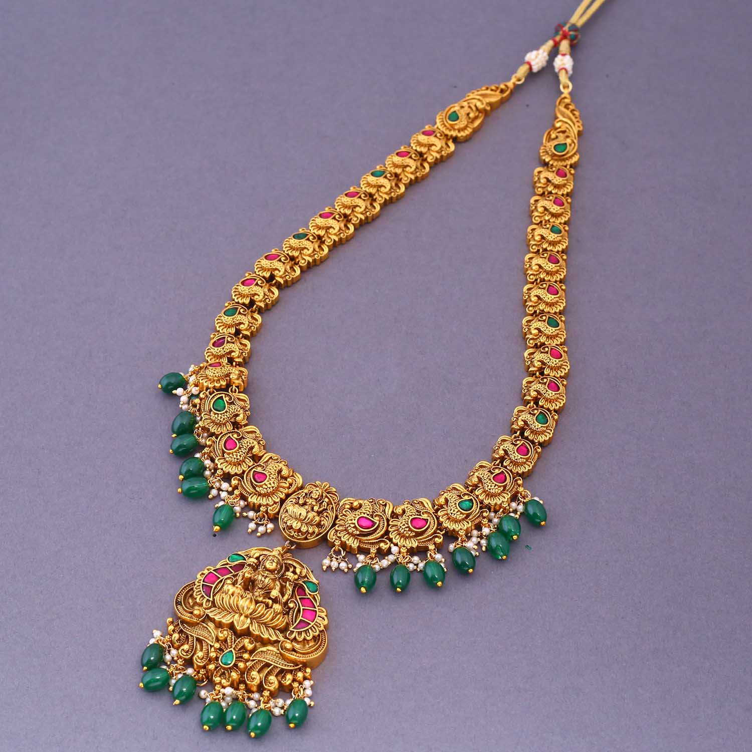 The temple necklace set epitomizes the grandeur and spiritual essence of Indian heritage, blending divine motifs with exquisite craftsmanship. Crafted with precision, each piece in the set showcases a harmonious blend of tradition and elegance.