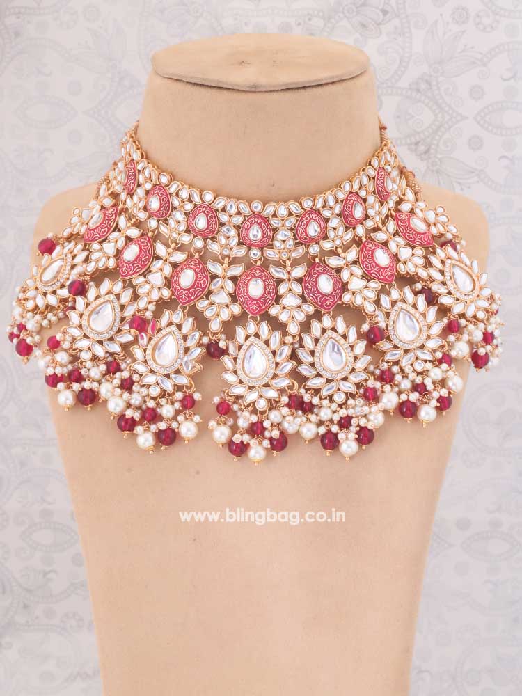 This necklace is the ultimate accessory option for the festive season. This set has a gorgeous circular floral pattern. The necklace has vibrant pearl detailing all over. The set also has a bright element of Kundan detailing in its structure. So, don't miss out on this gorgeous necklace set this eventful season as you have ramps to walk ahead.