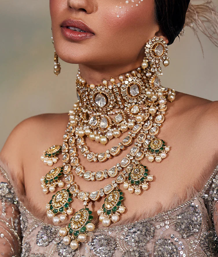 That feeling of summer when you look at the Endless Summer Necklace stays with you with its unbeatable sparkle, that depicts the summer sun & its rays of warmth, along with a blooming garden of Emerald flowers, studded with the finest of syndicate polki & round diamonds. The entire necklace is a smooth flow between glistering rows of syndicate polki, surrounded with round diamonds for maximum sparkles, into a heart-warming garden